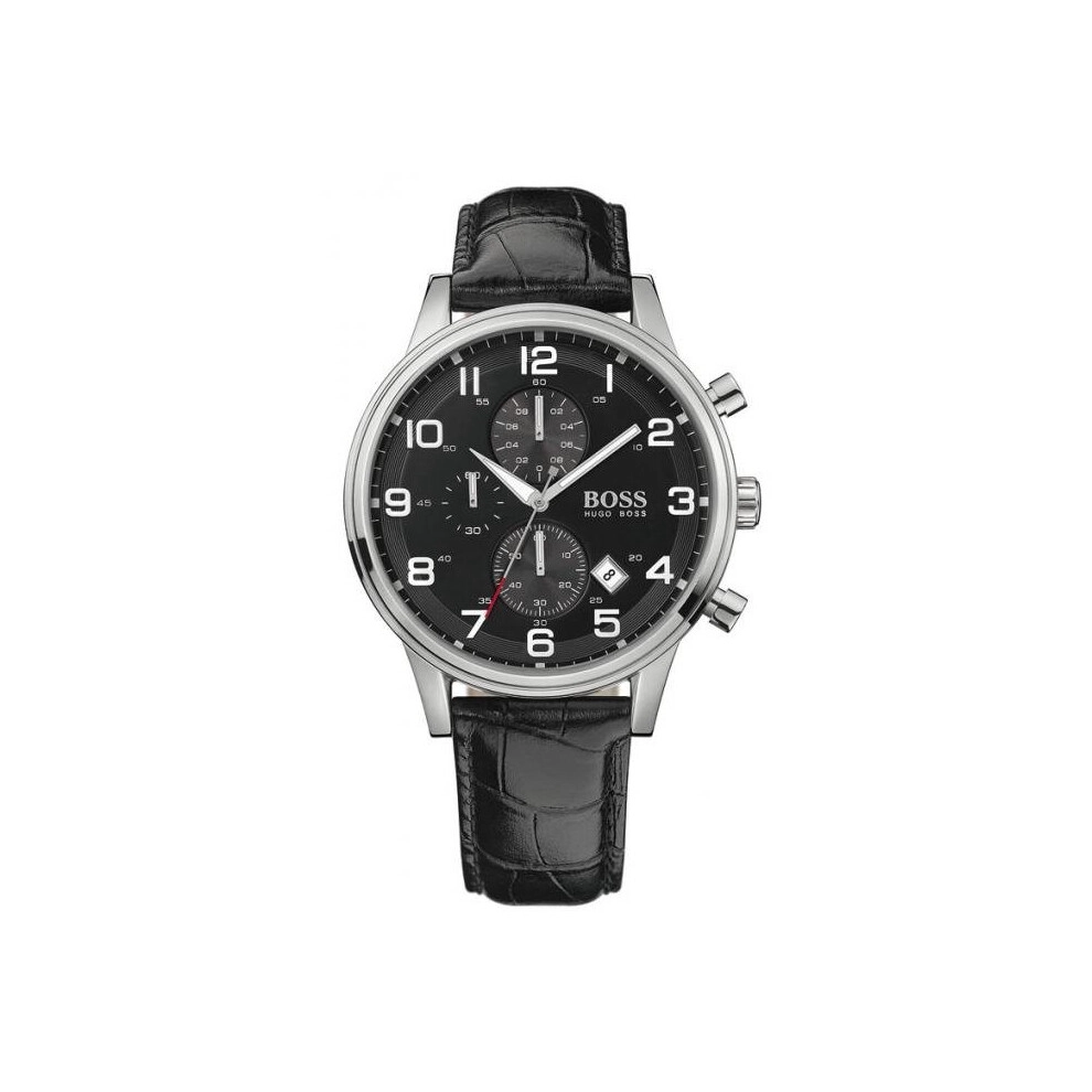 The Boss Watch HB-1512448 Men features an analog display, quartz movement, date functionality, mineral glass, steel material, and 50m water resistance. It has a black strap and a 44mm black face. The watch is silver in color and is from the Hugo Boss brand.