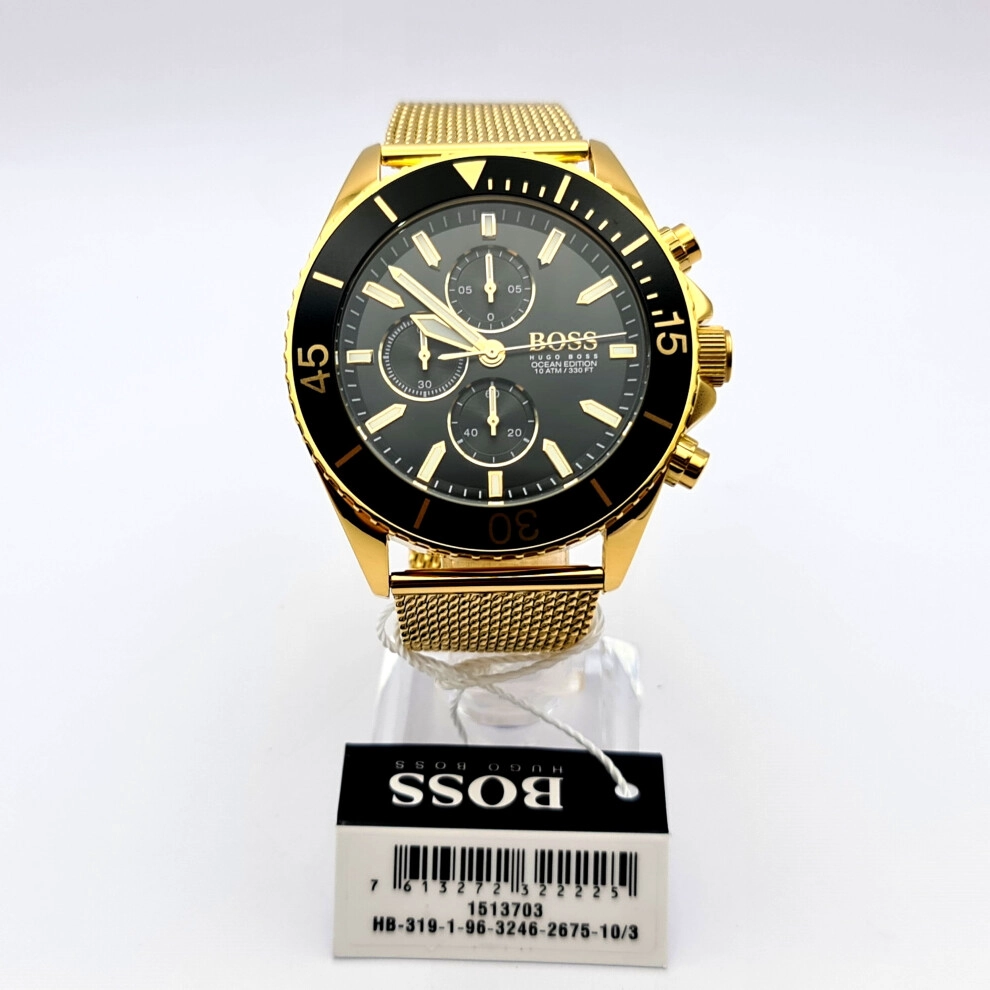 Hugo Boss Ocean Edition 1513703 is a genuine men's watch featuring a yellow gold mesh strap, black dial, and stainless steel case. It has a quartz movement, chronograph function, luminescent dial and hands, and is water-resistant up to 100 meters. The watch comes with official BOSS packaging and a 2-year BOSS warranty. Key specifications include a 48mm case width, round case shape, fold over clasp, mineral crystal glass, and an analogue display.