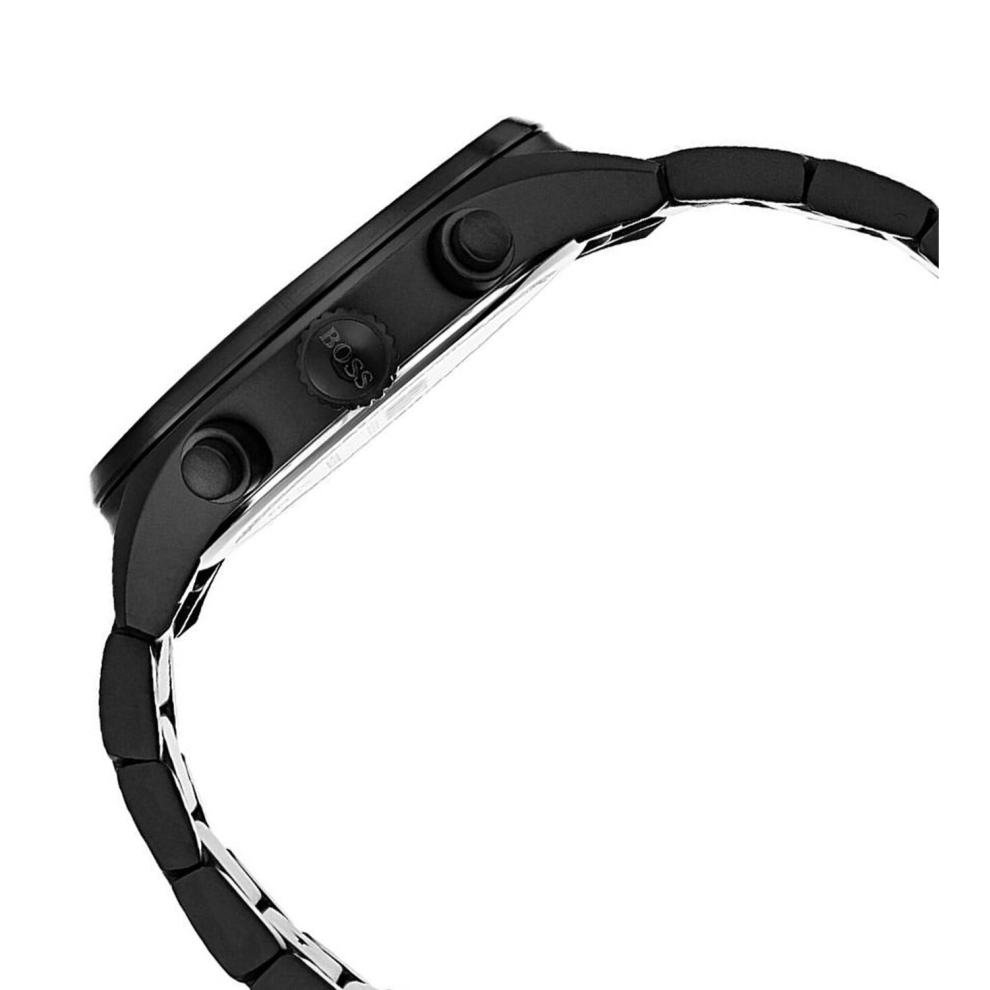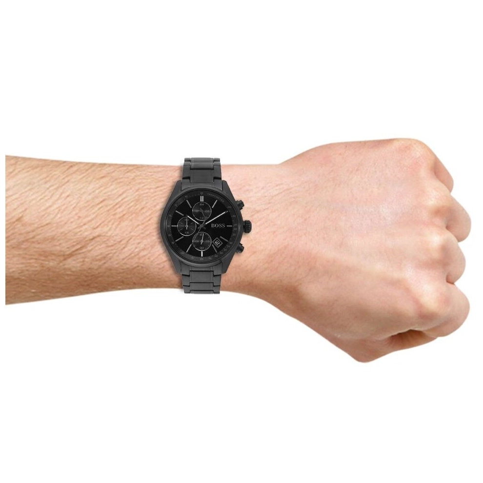 Hugo Boss Grand Prix 1513676 is a stainless steel men's watch with a black round case, black dial, and black stainless steel bracelet. It features a quartz movement, water resistance up to 50 meters, and a pushbutton deployment clasp.