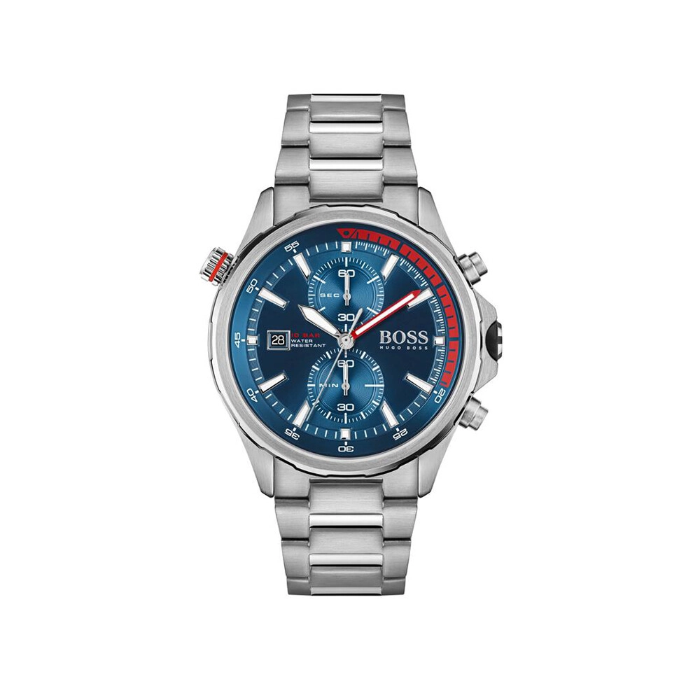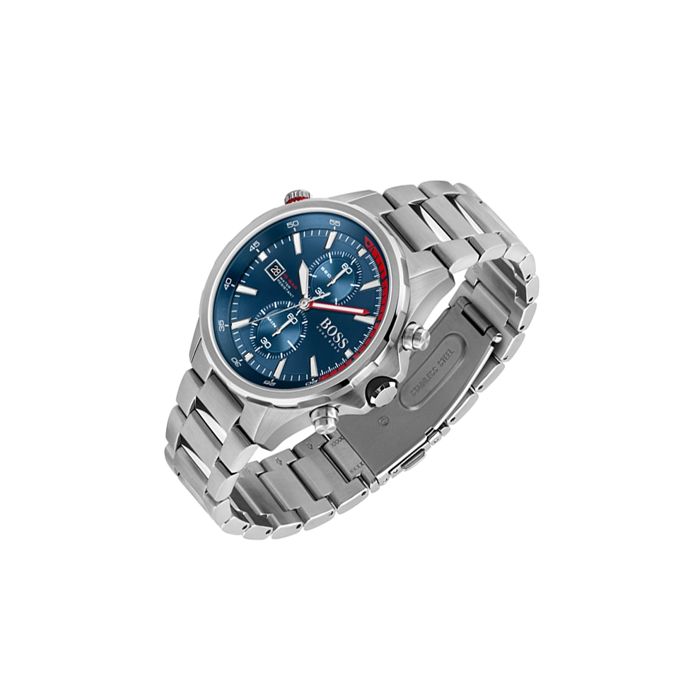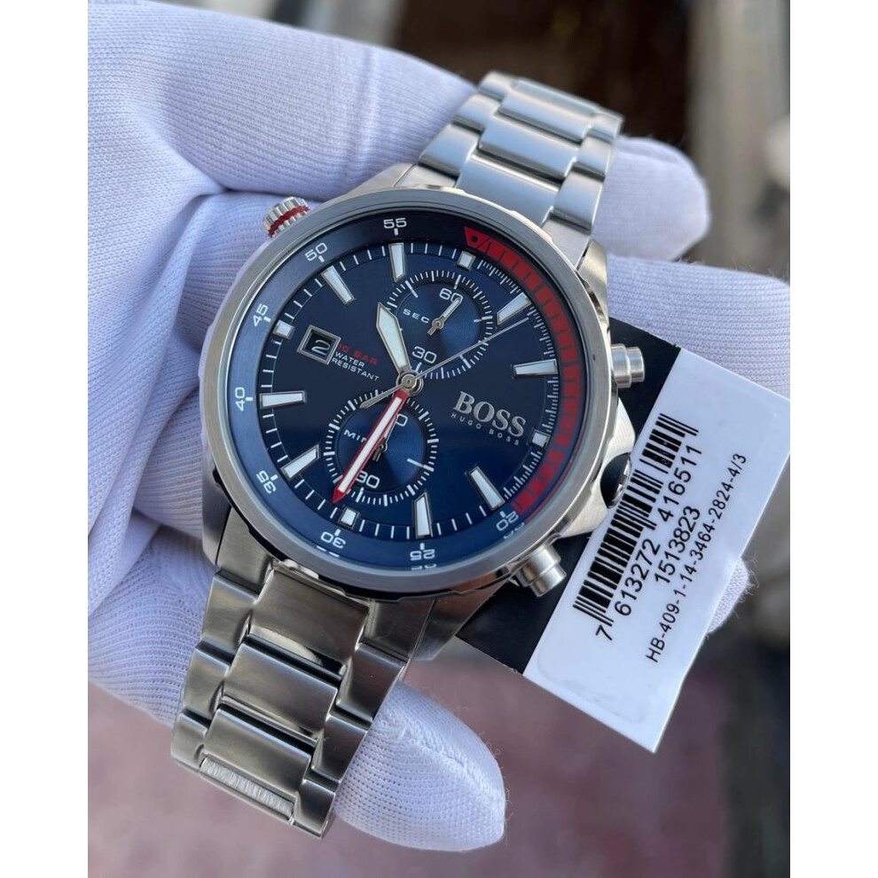 HUGO BOSS WATCH 1513823 is a men's wristwatch featuring a blue dial chronograph. Key specifications include a 46mm stainless steel case, 20mm stainless steel strap, quartz movement, analog display, mineral crystal glass, 100m water resistance, and a deployment clasp with push button. The watch is available in blue and silver colors, making it a perfect gift for men.