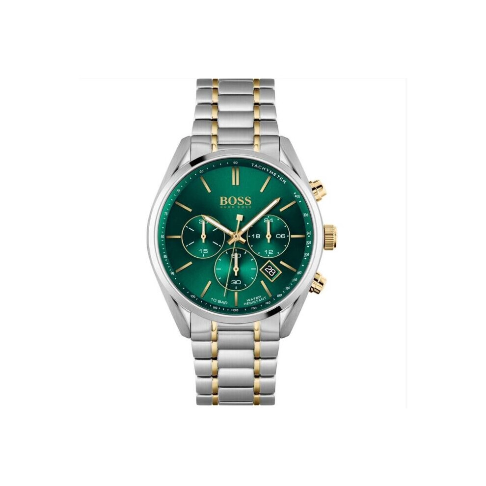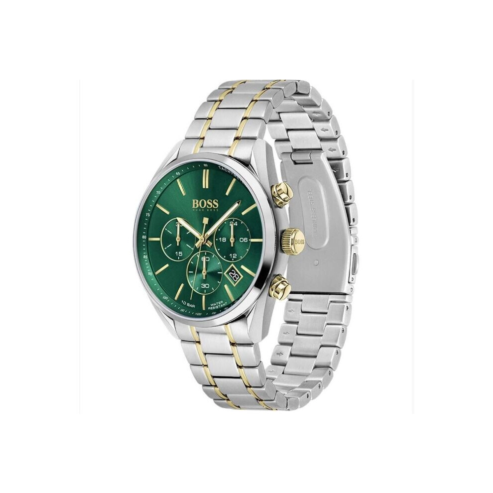 The Hugo Boss Champion HB1513878 is a premium men's watch that exemplifies sophisticated style and functionality. This authentic timepiece features a distinctive green dial complemented by a two-tone silver and gold stainless steel construction.