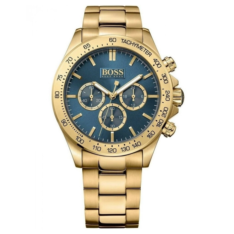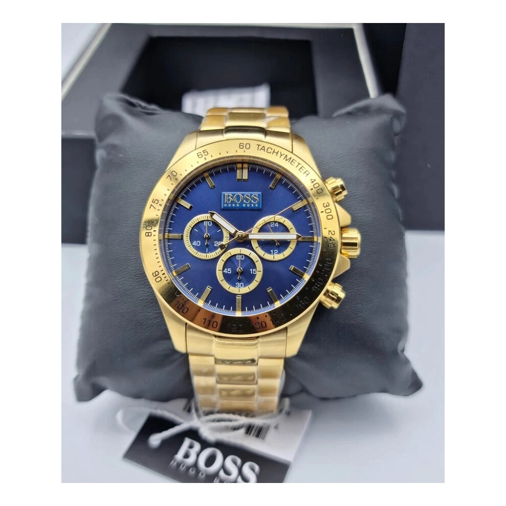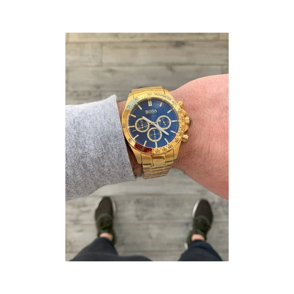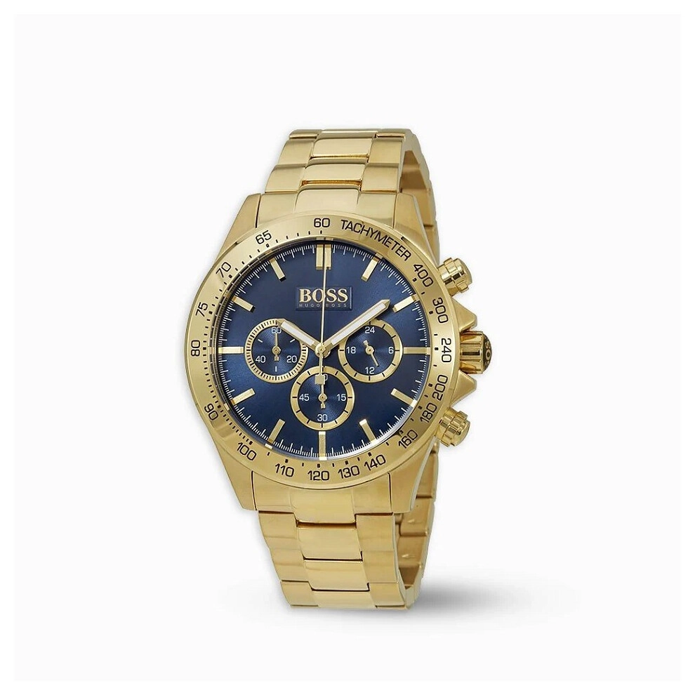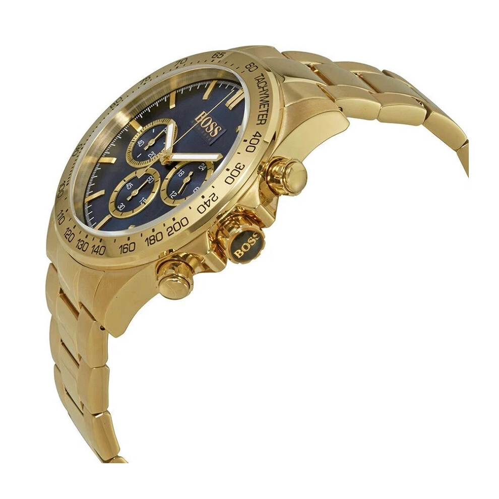The Hugo Boss HB1513340 Ikon Men's Watch features a gold tone exterior with a blue dial, made from durable stainless steel. It includes a chronograph, tachymeter, and is water-resistant up...