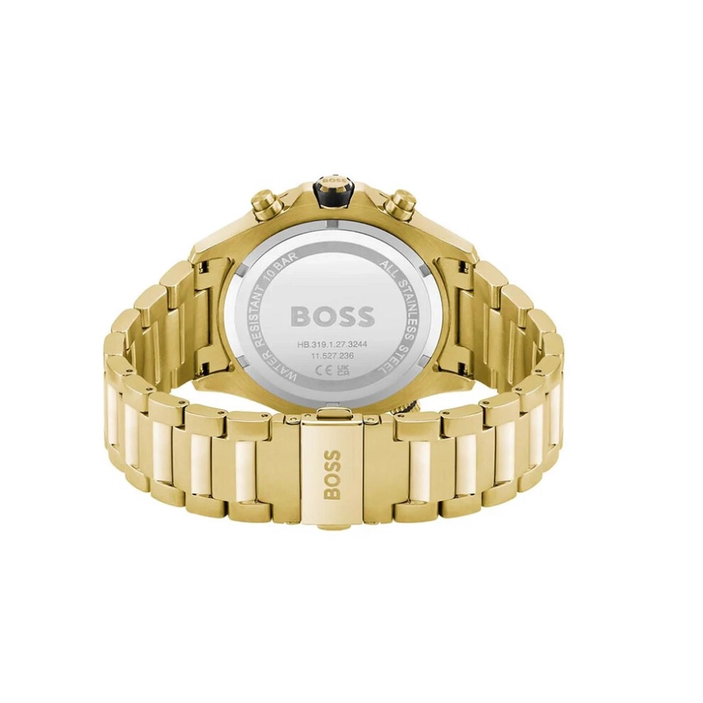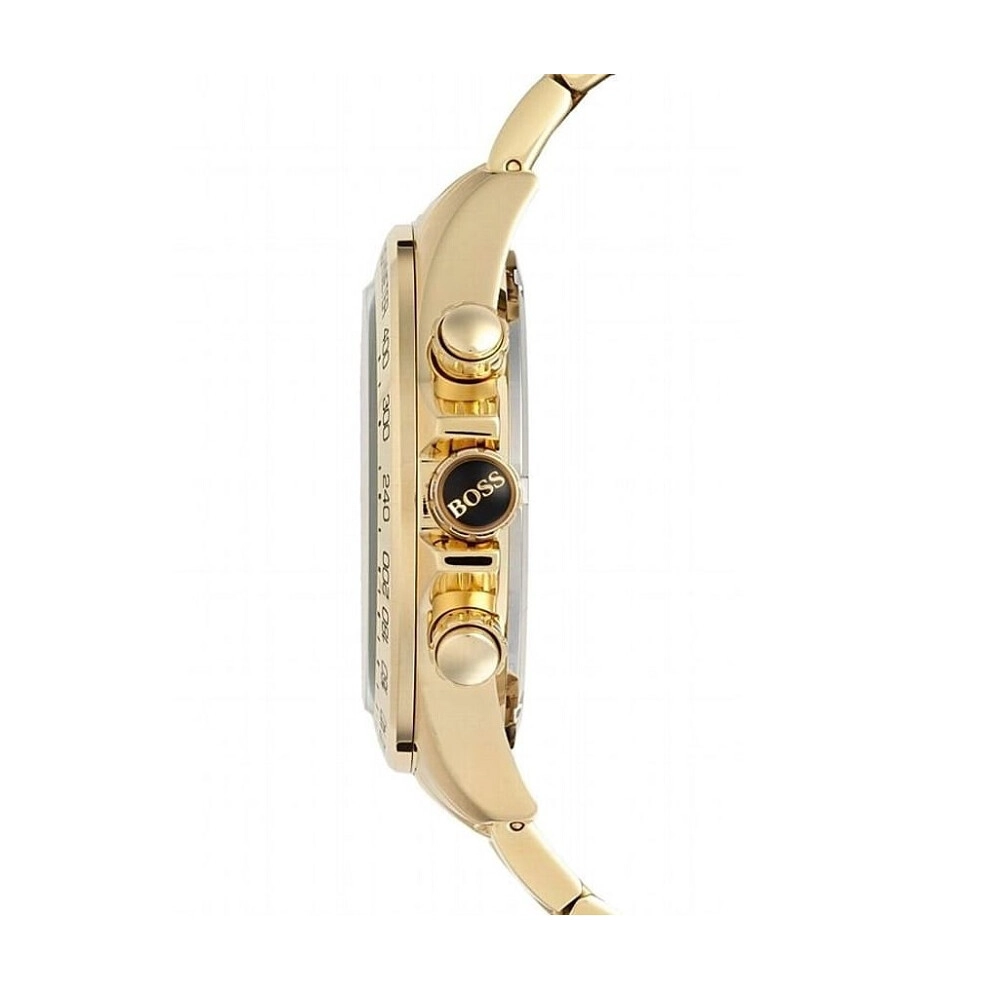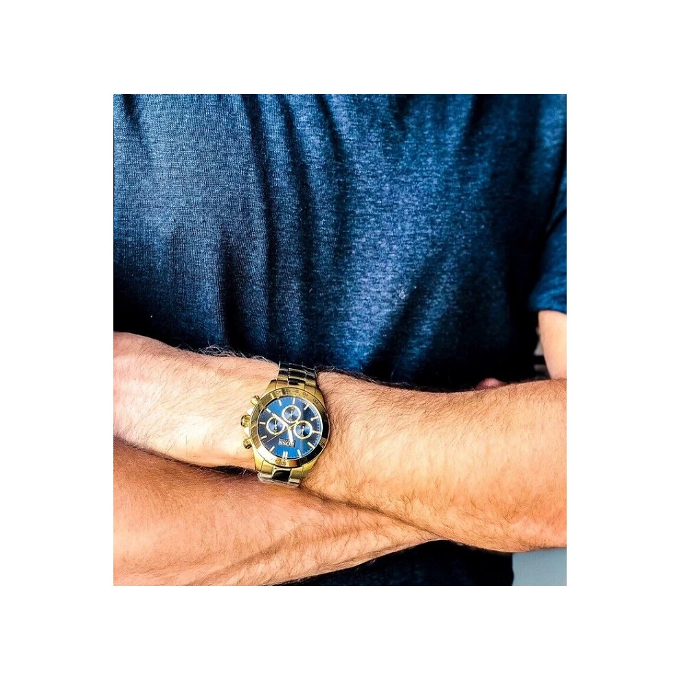 Hugo Boss Men's 1513340 Gold Bracelet Blue Dial Gold Case Watch features a 44mm gold case, stainless steel bracelet, blue dial, and white and gold tone hands. It has a quartz movement, is water-resistant up to 50 meters, and comes with a 2-year warranty on the watch movement. Packaged with a box, manual, and tags.