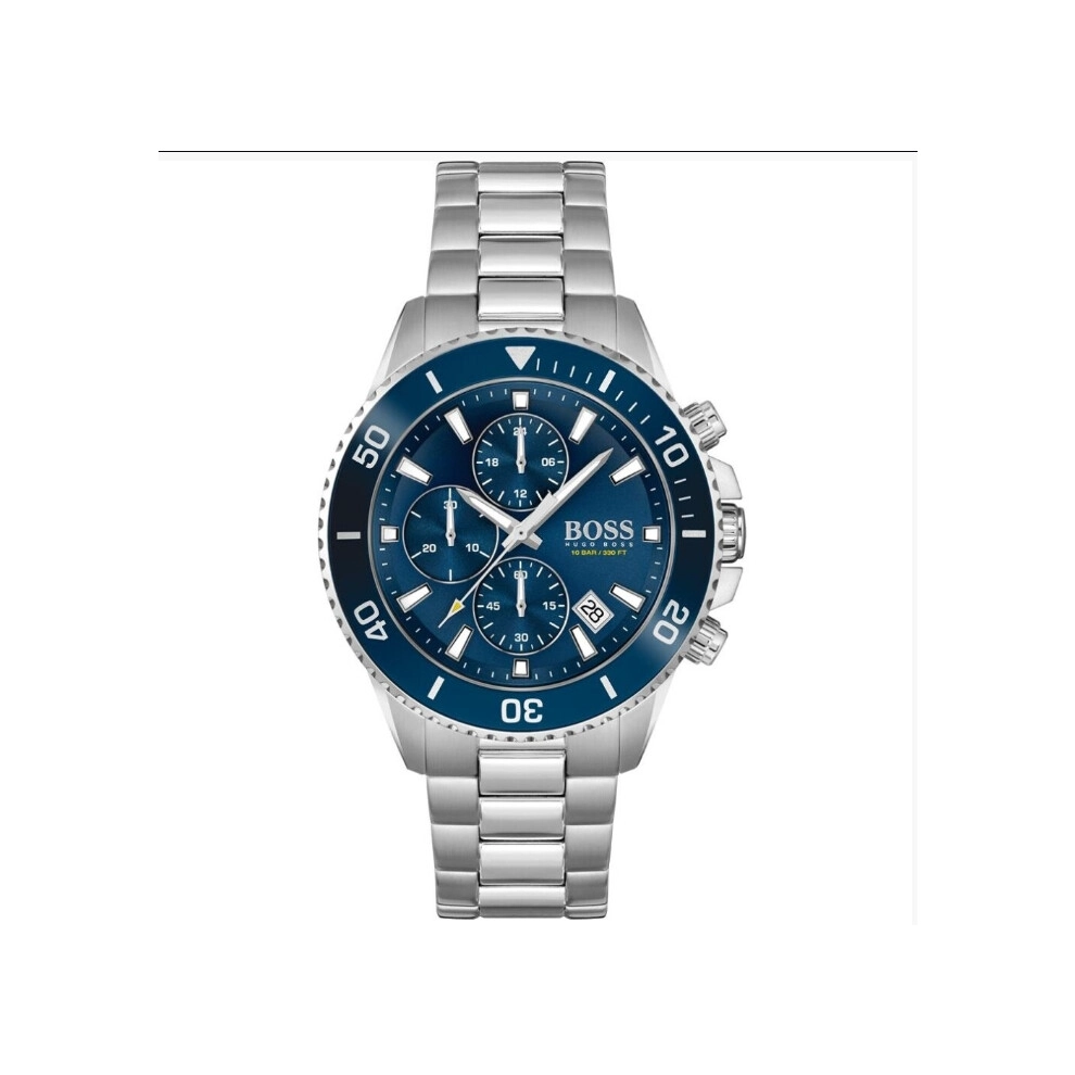 Hugo Boss 1513907 Admiral Chronograph Blue Dial Men's Watch features a chronograph movement with date function, 11.95mm case thickness, 45mm case diameter, blue dial with blue bezel, stainless steel bracelet, and 10ATM water resistance.