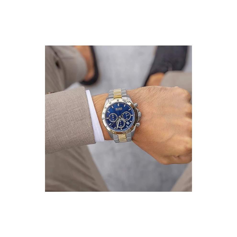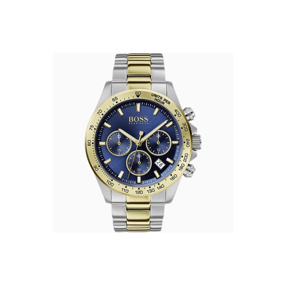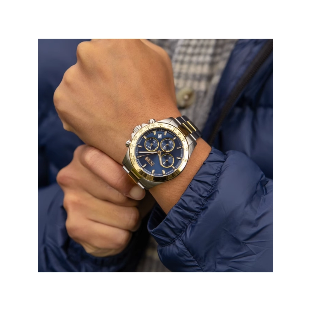 Turn heads & always be on time with this designer timepiece from Hugo Boss. Exterior features a two-tone stainless steel & yellow gold-plated bracelet. The face is finished off with a blue dial complete with yellow gold accents. Comes complete with chronograph movement as well as a handy date function. 5ATM of water resistance keeps it safe from the rain & splashing water.