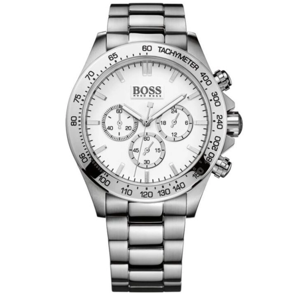 Hugo Boss Ikon Men's Chronograph Watch HB1512962 features a polished stainless steel case and bracelet, a white dial, and a mineral glass face. It is water-resistant up to 100M/10ATM and includes a chronograph and tachymeter. The watch is designed for durability and style, suitable for dress/formal occasions.