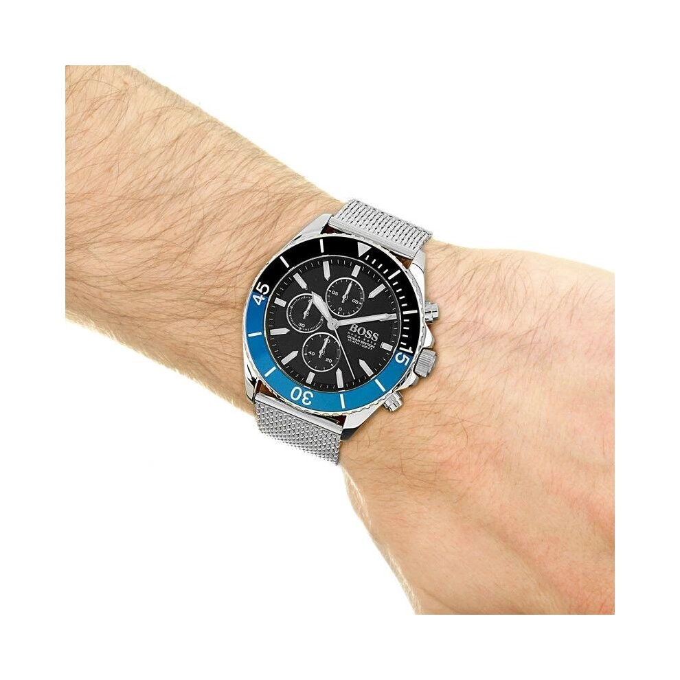 Hugo Boss 1513742 Ocean Edition Men's Watch features a chronograph movement, 12mm case thickness, 46mm case diameter, black dial, stainless steel mesh bracelet, and 10 ATM water resistance. The watch is silver in color and has an OPC code of P6CS77Y.