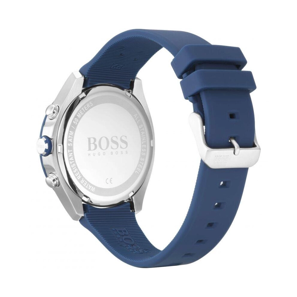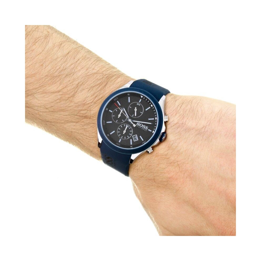 Hugo Boss 1513717 Velocity Men's Watch features a silver case, blue silicone strap, black dial, mineral glass, quartz movement, date display, and is splashproof with 5 ATM water resistance. The watch has a stainless steel case, strap buckle closure, and is designed for men.