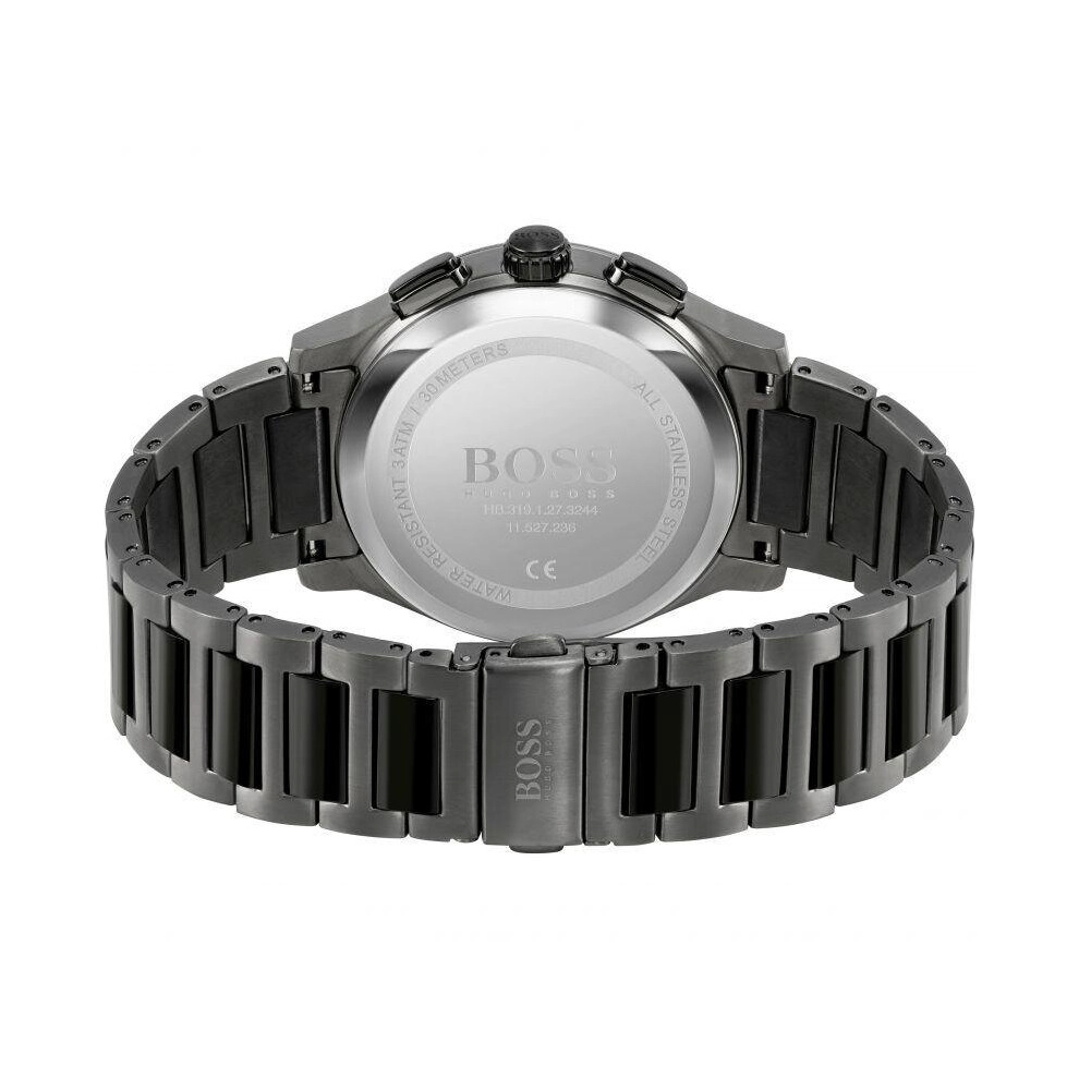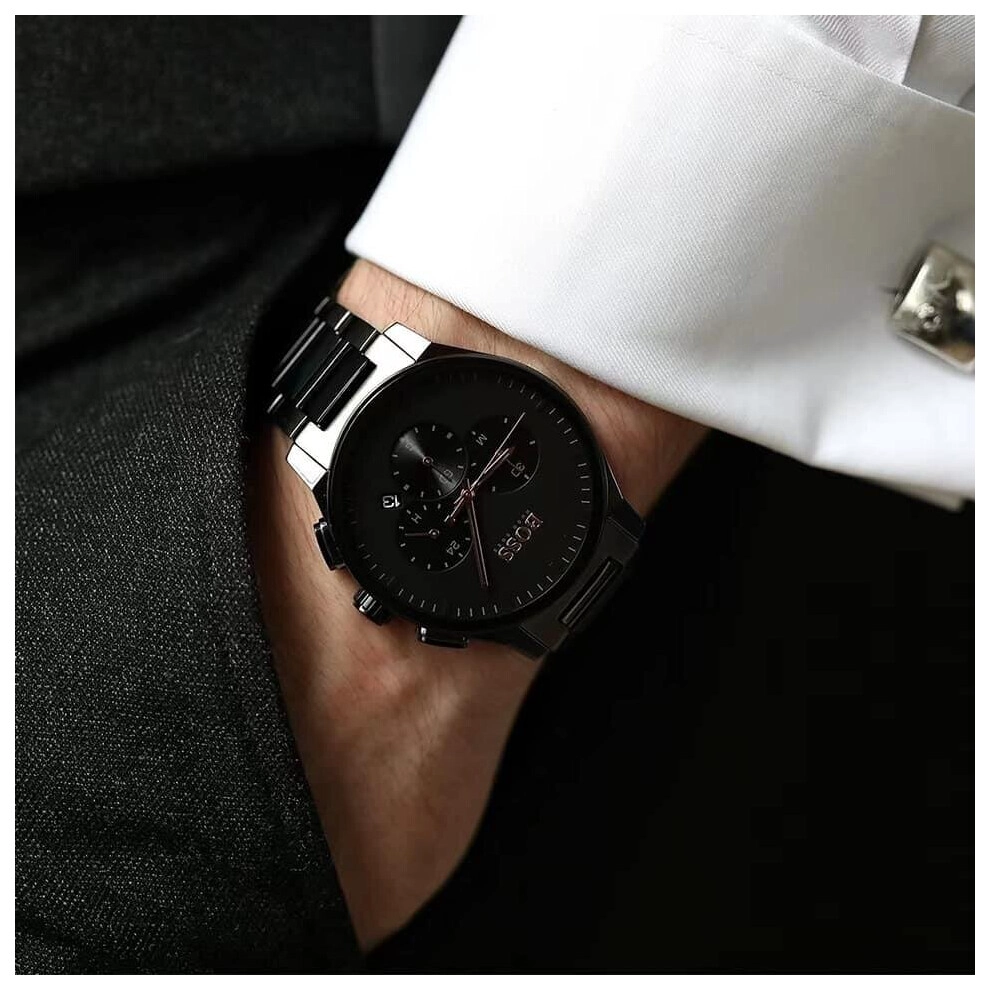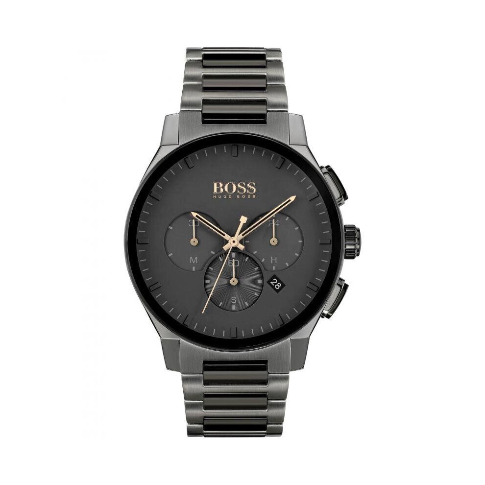 Set against this dark background are the chronograph's watch hands. Coloured rose gold, they create a classy contrast for the watch to feel as rich as caviar, and make it easy to tell what time it is with a single glance. This look is polished off with the inimitable Hugo Boss logo in the same colour placed at the face's top.