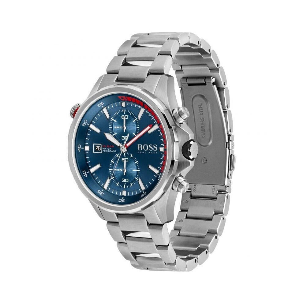 Hugo Boss 1513823 Analog Blue Dial Men's Watch features a 46mm stainless steel case, blue round dial, quartz movement, analog display, mineral crystal glass, and 100m water resistance. The watch has a stainless steel strap and a deployment clasp with push button.