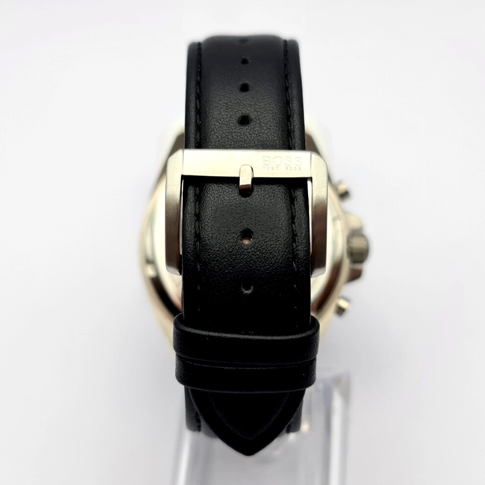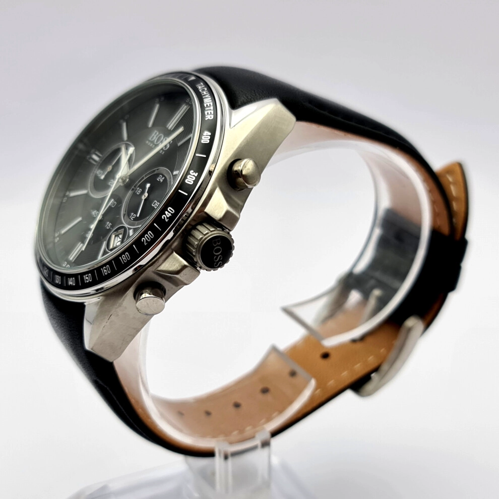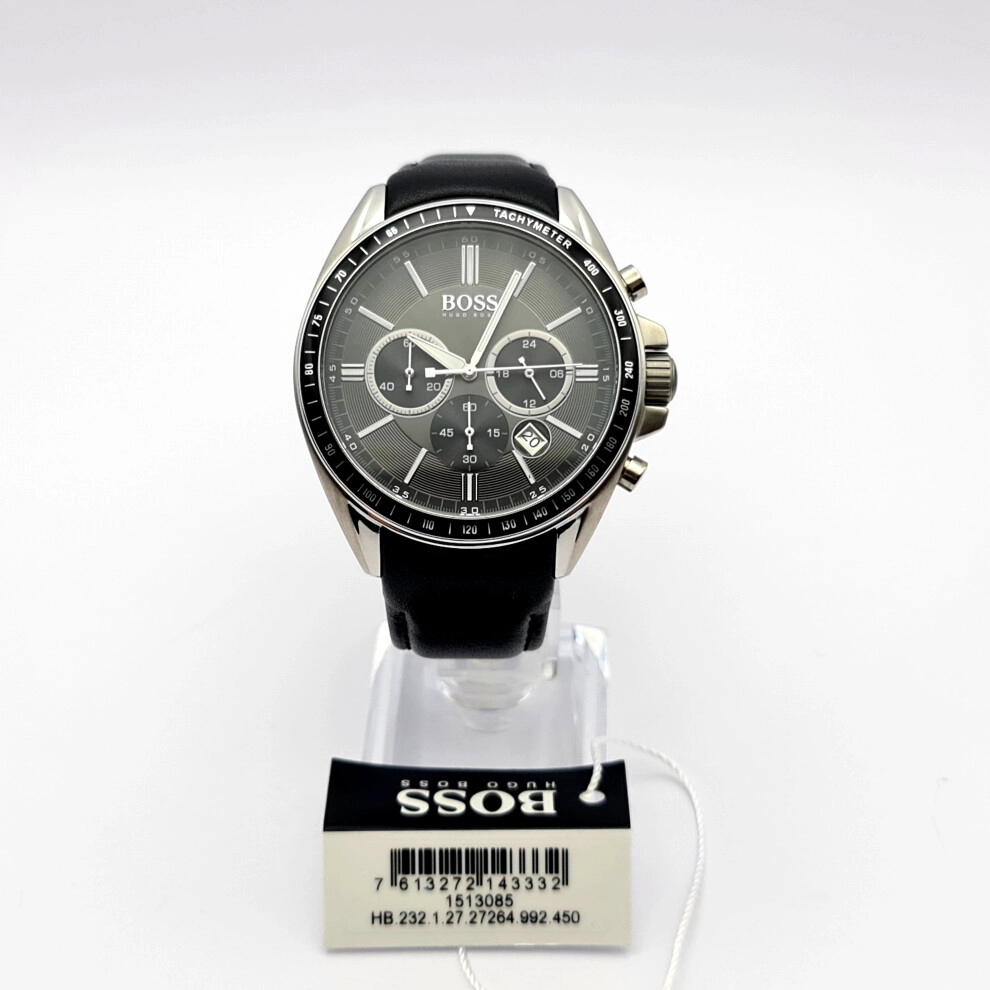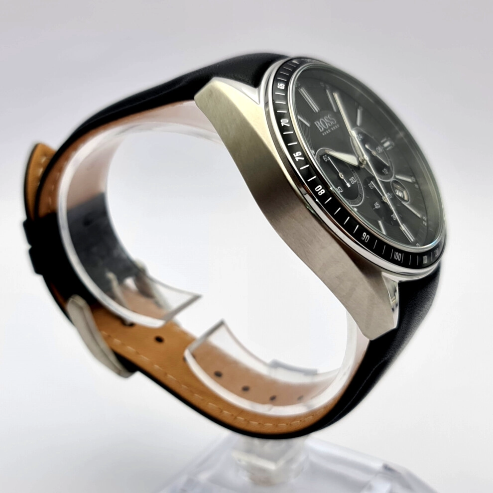 This men's Hugo Boss 1513085 watch features a stainless steel case with a chronograph quartz movement. It comes with a black leather strap and black dial, plus convenient date function for everyday use.