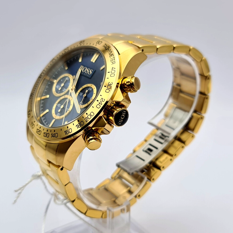 The Hugo Boss Ikon 1513340 is a gold stainless steel men's watch featuring a 44mm gold ion-plated round case, a blue enamel dial, and a gold-tone bracelet. It has a quartz movement, scratch-resistant mineral crystal, and is water-resistant up to 100 meters. The watch also includes chronograph functions, luminescent hands and markers, and a tachymeter bezel.