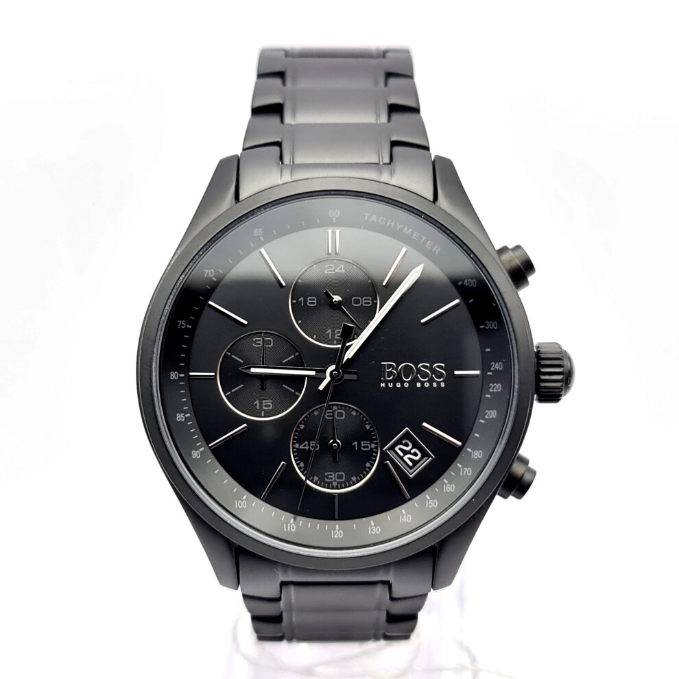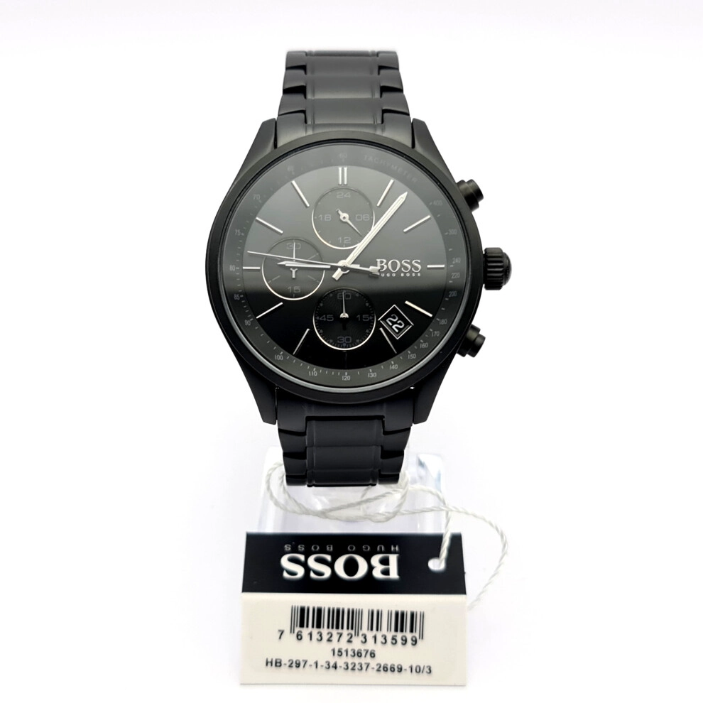 The NEW HUGO BOSS GRAND PRIX 1513676 is a stainless steel all black men's watch featuring a 44mm round case, black dial, and black stainless steel bracelet. It has a quartz movement, is water-resistant up to 50 meters, and is ranked #666 in Watches For Men and Men's Watches categories.