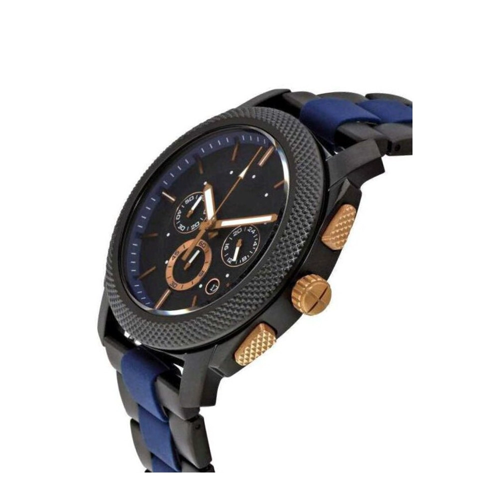 - Black stainless steel case with black dial; blue silicone and black stainless steel bracelet band; links can be removed for a customized fit; interchangeable with all 24mm Fossil watch straps