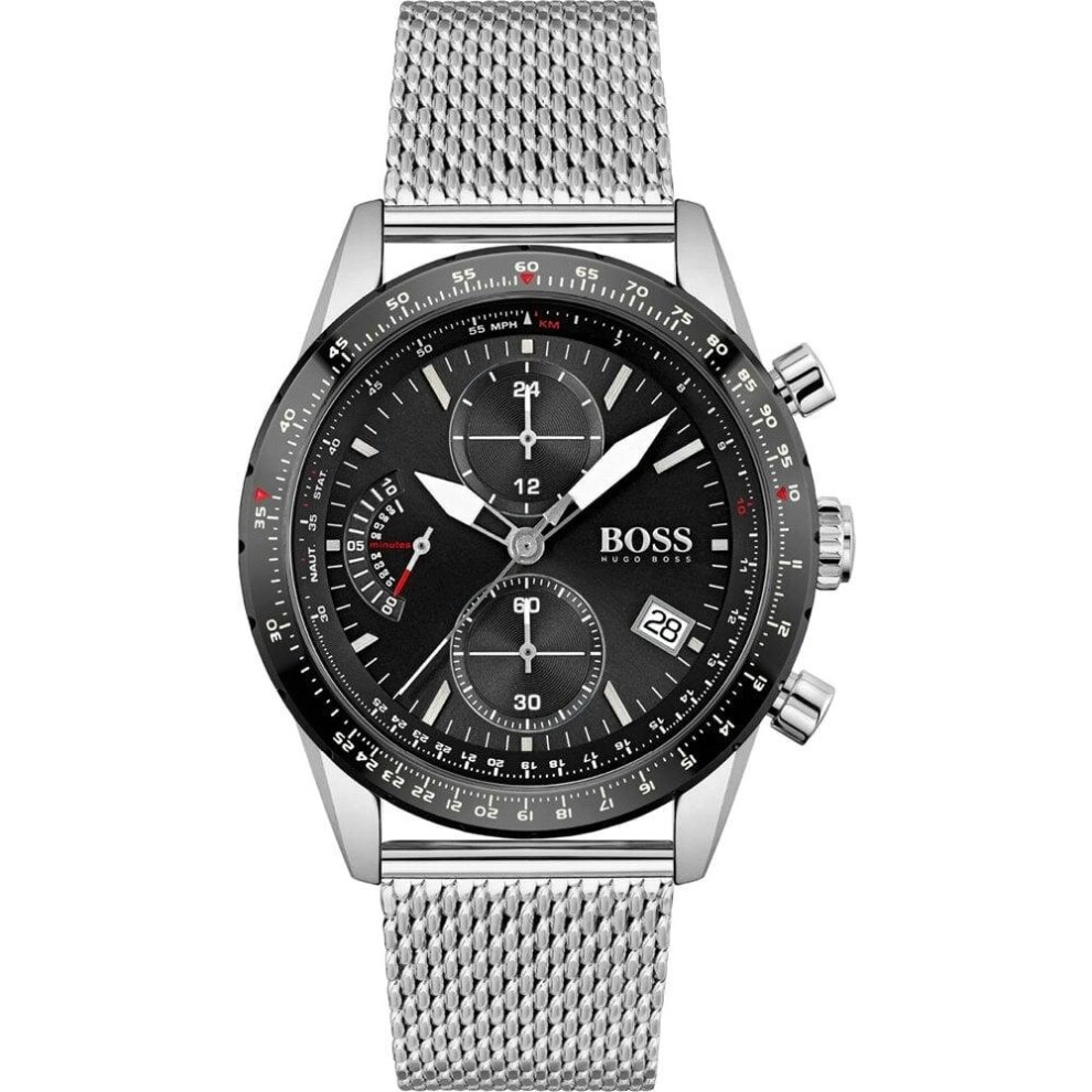 Hugo Boss 1513886 Chronograph Pilot Edition Men's Watch features a chronograph movement with date function, 11.95mm case thickness, 44mm case diameter, black dial, stainless steel mesh bracelet, and 5ATM water resistance. It is silver in color and suitable for showering or swimming but not scuba diving.