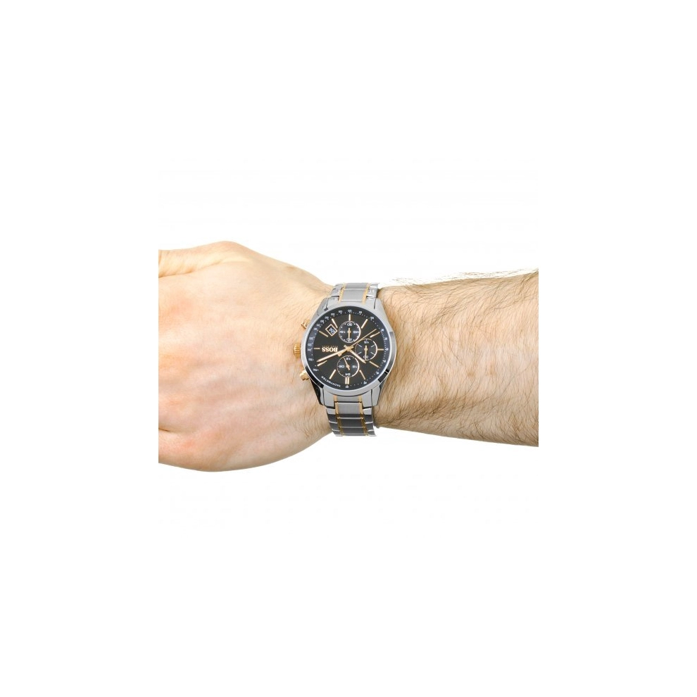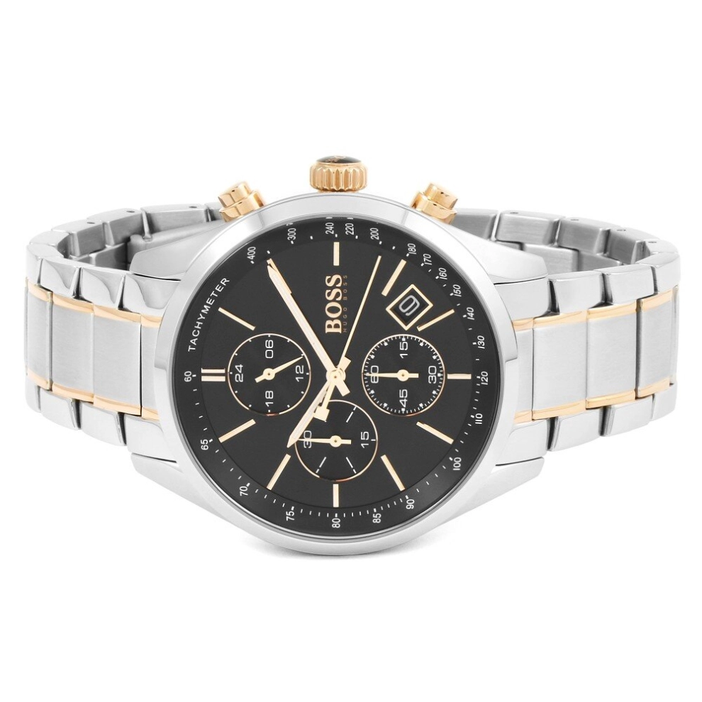 The Hugo Boss Grand Prix 1513473 is a functional and special men's timepiece that combines luxury with precision. Crafted with a sophisticated two-tone steel and rose gold plated case, this watch features an elegant black dial that gives it a unique and distinguished appearance. The timepiece includes advanced features such as chronograph functionality and date display, making it perfect for the modern gentleman.